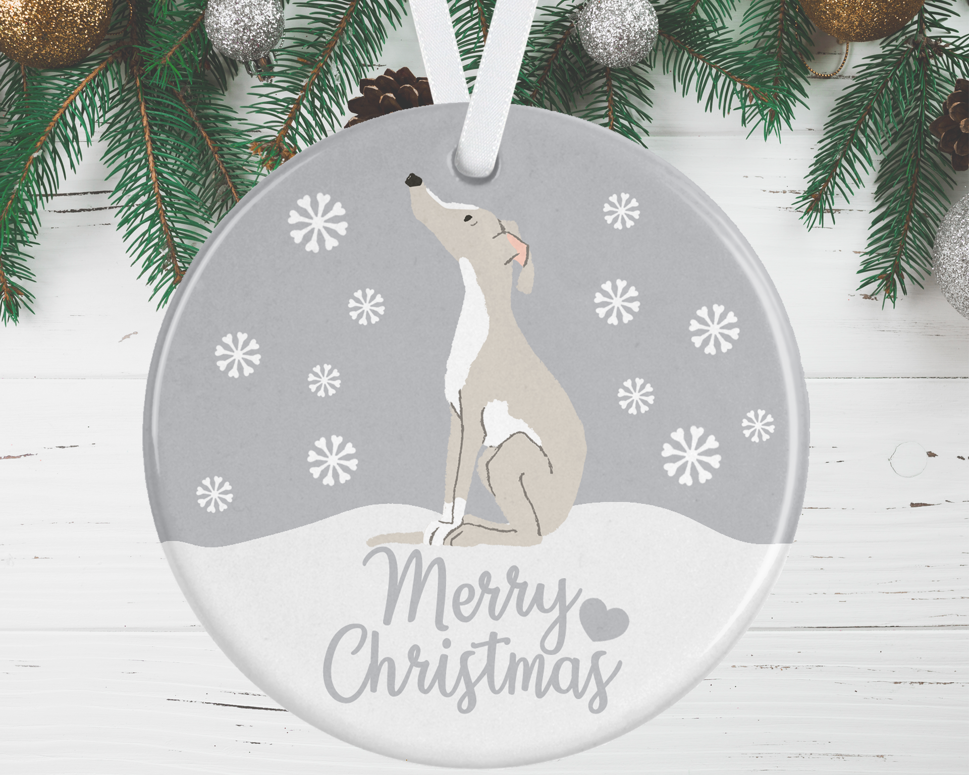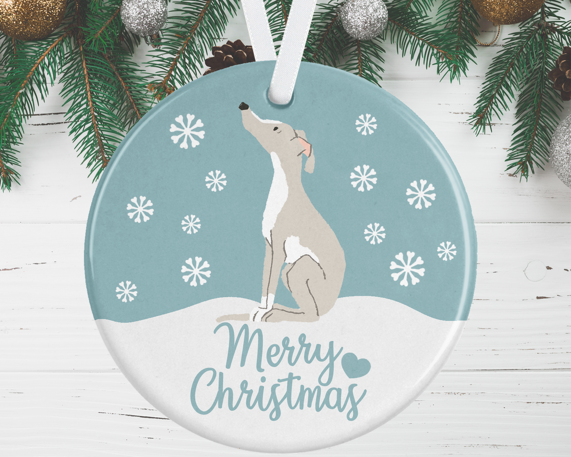 Finish off your Christmas tree with this gorgeous Italian Greyhound Christmas Ornament, available in 4 background colour options to complement your colour scheme.