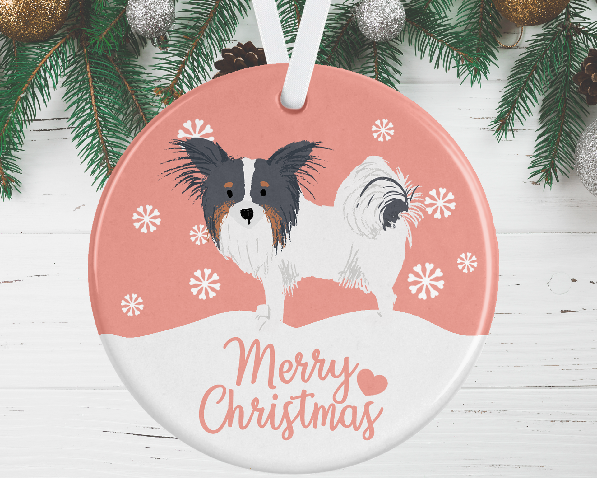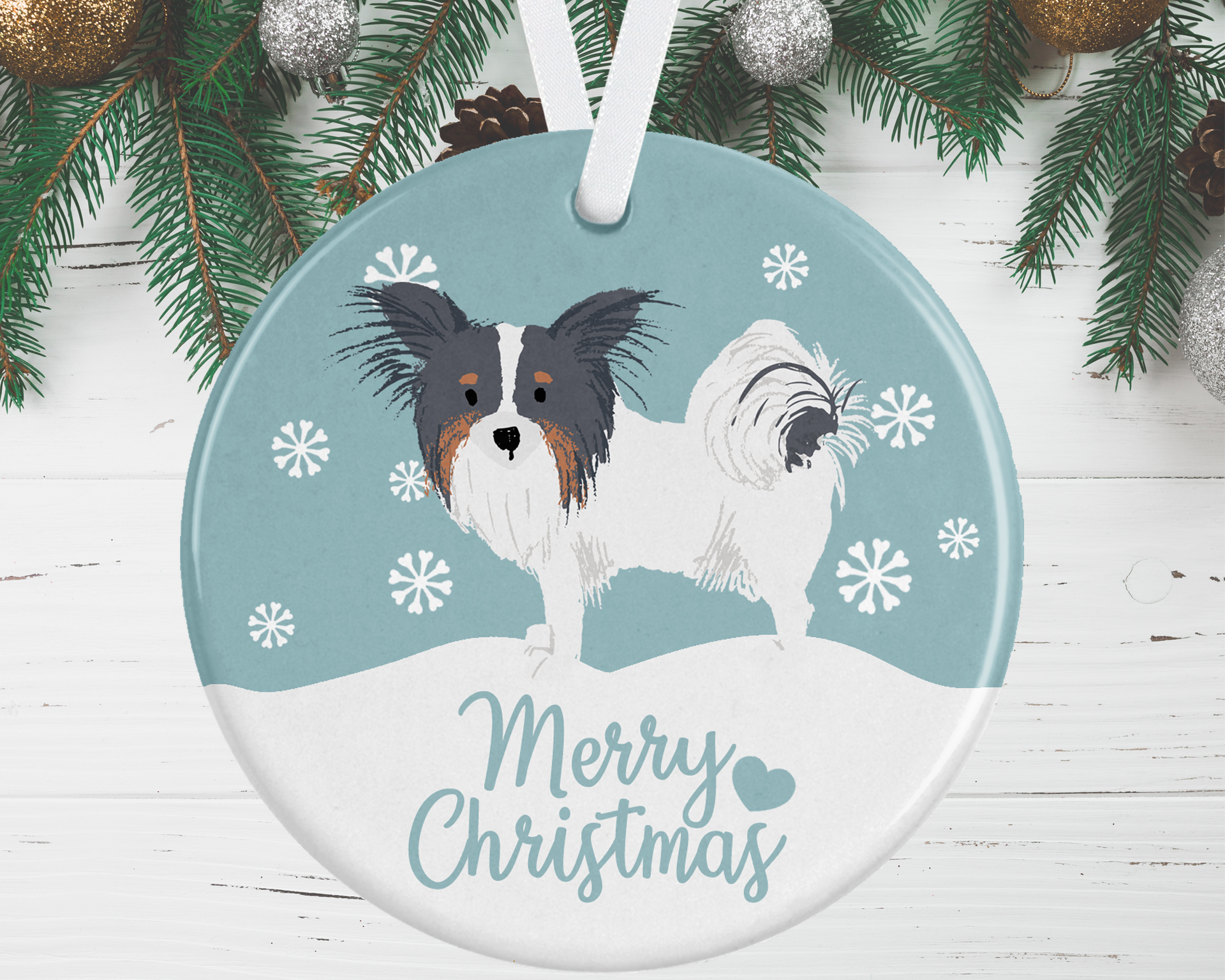 Finish off your Christmas tree with this gorgeous black, tan and white white Papillon Christmas Ornament, available in 4 background colour options to complement your colour scheme.
