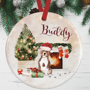 Decorate your tree with this personalised ceramic Christmas ornament featuring a Brown Staffie sitting in front of a beautiful festive fireplace.