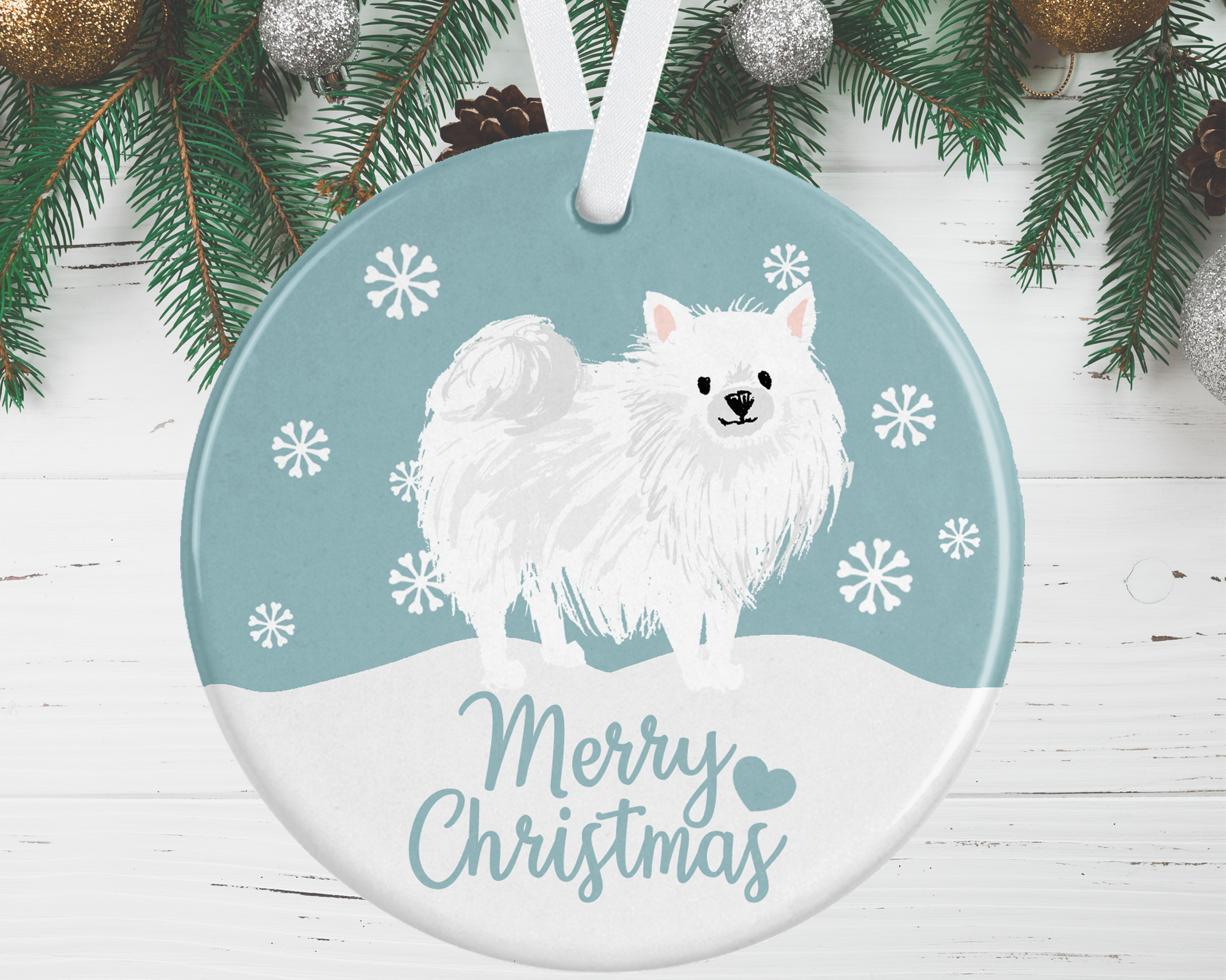 Finish off your Christmas tree with this gorgeous white Pomeranian Christmas Ornament, available in 4 background colour options to complement your colour scheme.