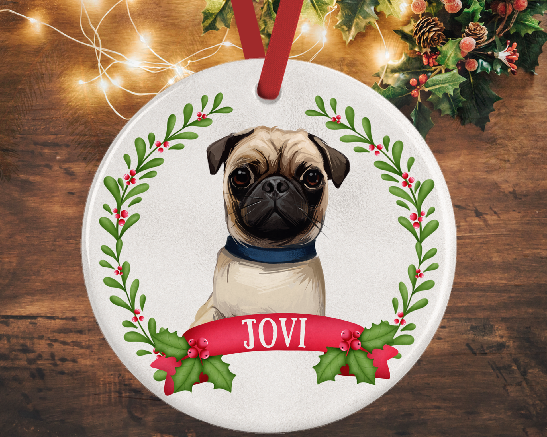 Brighten up your tree with this custom ceramic Christmas ornament featuring an irresistibly cute Pug surrounded by a festive holly wreath. Add their name to make it extra special! 🎄😍