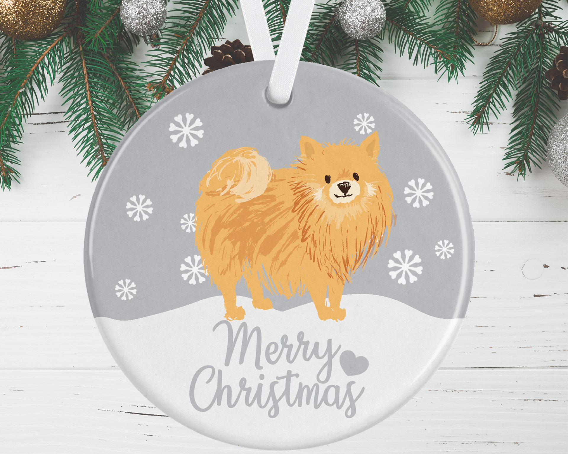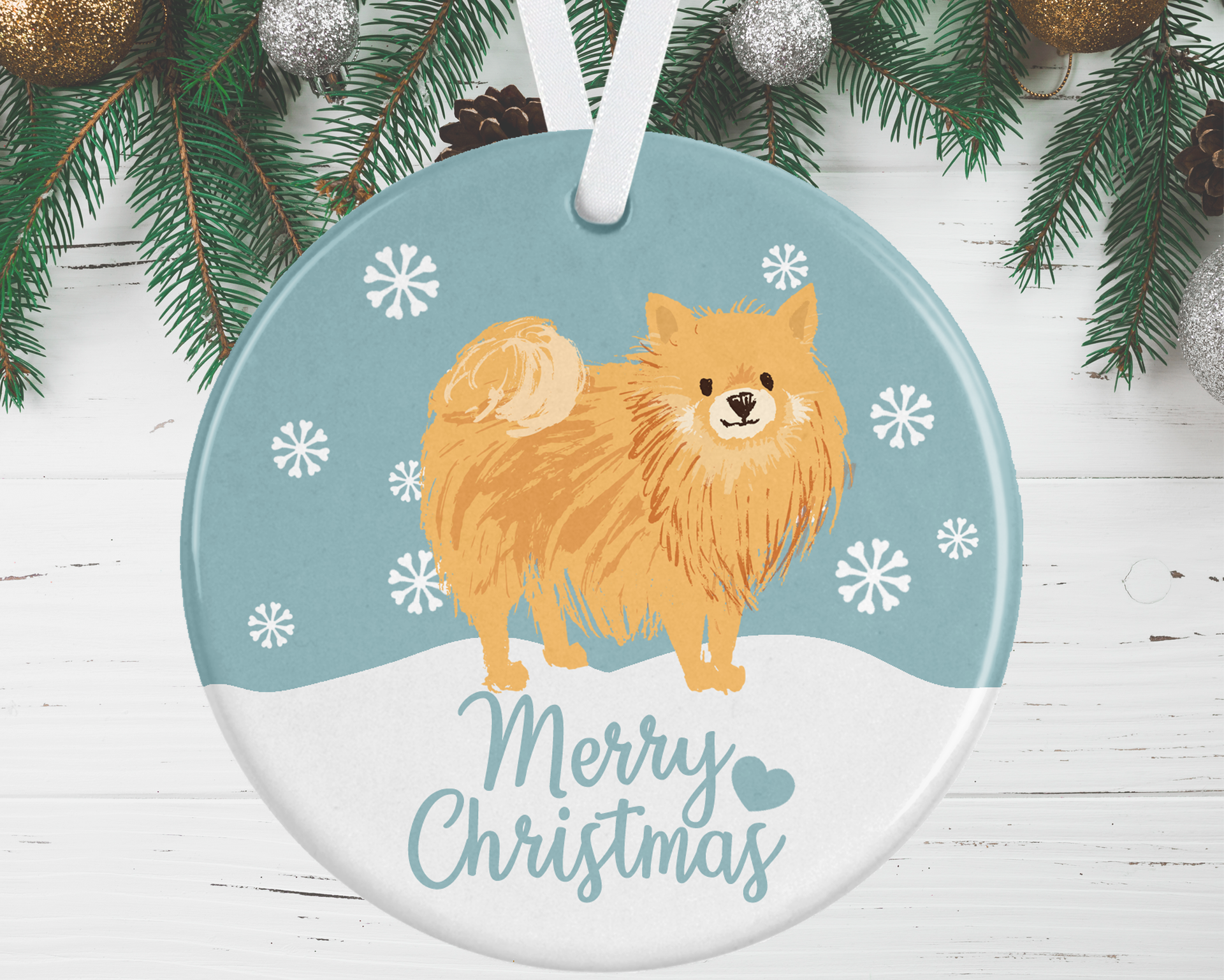 Finish off your Christmas tree with this gorgeous tan Pomeranian Christmas Ornament, available in 4 background colour options to complement your colour scheme.