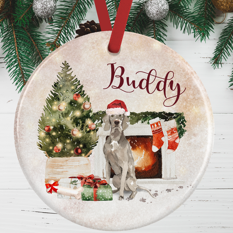 Decorate your tree with this personalised ceramic Christmas ornament featuring a Weimeraner sitting in front of a beautiful festive fireplace.