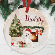 Decorate your tree with this personalised ceramic Christmas ornament featuring a Westie sitting in front of a beautiful festive fireplace.