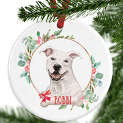 Decorate your tree with this personalised ceramic Christmas ornament featuring a white Staffie in a stylish rose gold festive frame.
