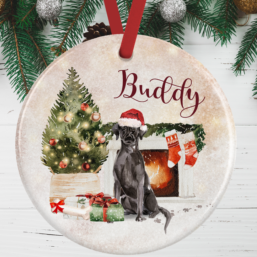 Decorate your tree with this personalised ceramic Christmas ornament featuring a Black Labrador sitting in front of a beautiful festive fireplace.