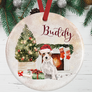 Decorate your tree with this personalised ceramic Christmas ornament featuring a Jack Russell sitting in front of a beautiful festive fireplace.